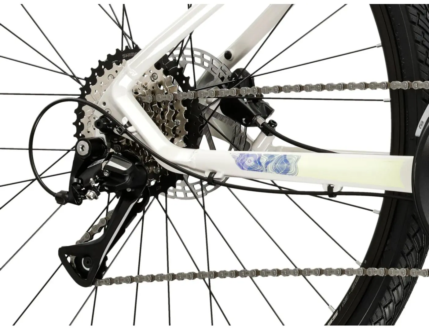 Amortyzowany widelec SR Suntour ze skokiem 63 mm sprawi, że bez problemu dojedziesz do miejsca docelowego bez martwienia się o krawężniki czy kostkę brukową. W lesie natomiast możliwa będzie jazda bez obaw o kamienie czy korzenie.